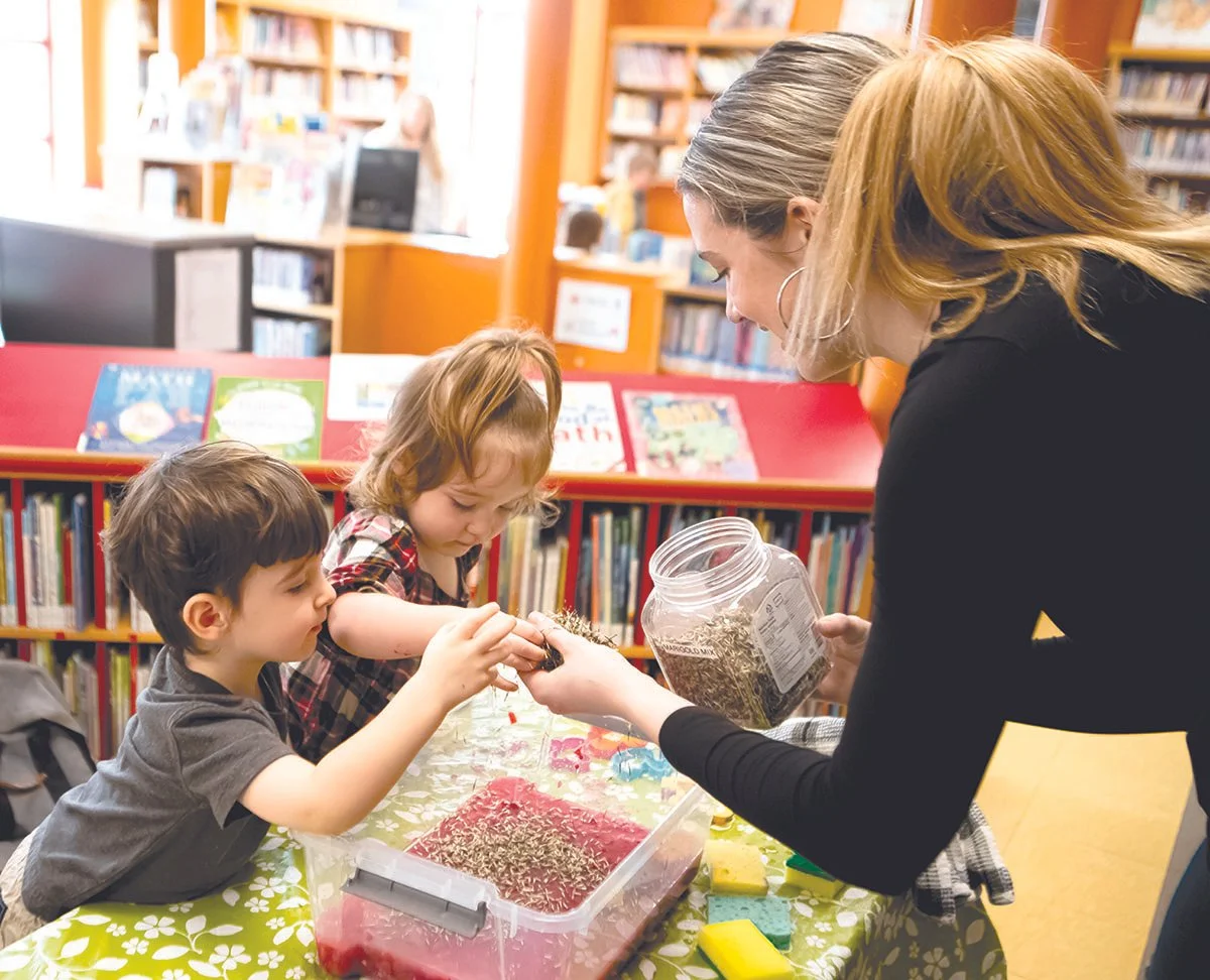 PLANTING PAPER FLOWERS - Claire Cleary of the Uxbridge Public Library helps Ryat and Bella Ouimet plant marigold seeds in a mushy mixture that will eventually turn into paper. The children made their seed and paper mixture, which can be planted in the ground, during Seedy Saturday, held last Saturday at the library. Photo by John Cavers