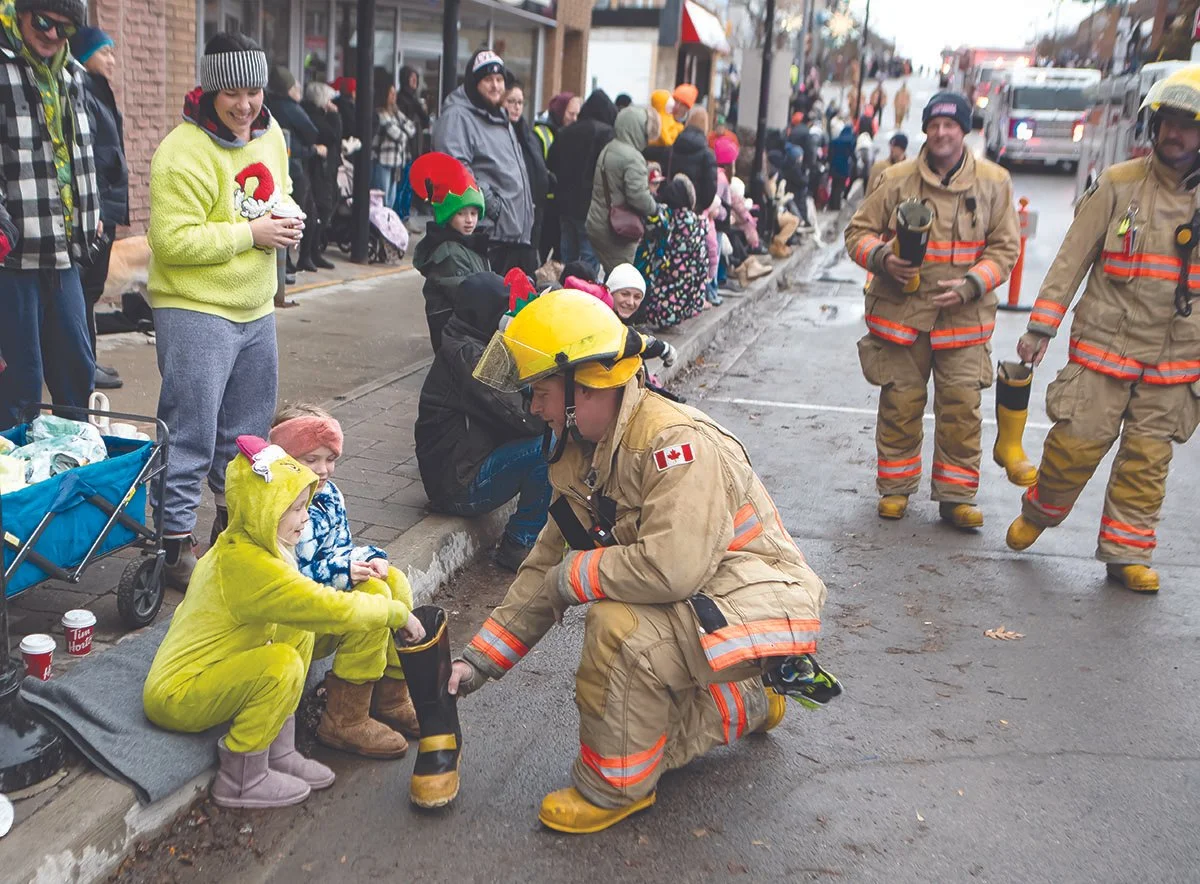 A young Santa Claus parade watcher drops money into a rubber boot for an Uxbridge Firefighters. The local firefighters traditionally open the Uxbridge parade with their impressive trucks, and several walk the street, boots in hand, collecting money for the food bank and other local charities. Threatening weather dampened few spirits at the parade, held last Saturday morning. Photo by John Cavers