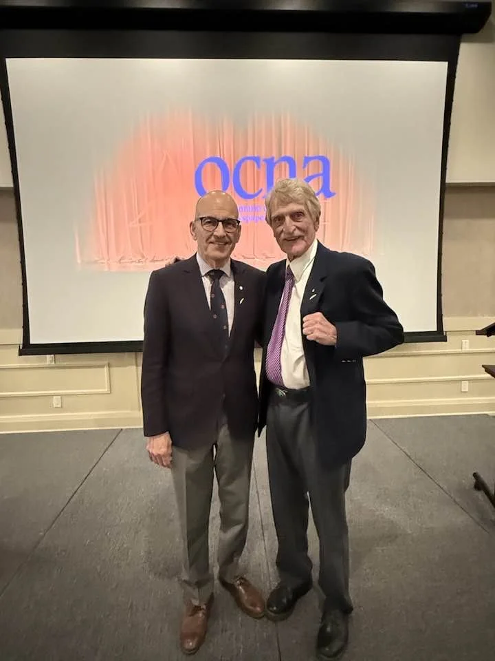 Ted Barris, left, and Roger Varley sport their newly acquired Gold Quills at the the Ontario Community Newspaper Association’s annual awards gala. Gold Quills are presented by News Media Canada to those who have worked in the newspaper industry for 50+ years. Photo by Lisha Van Nieuwenhove