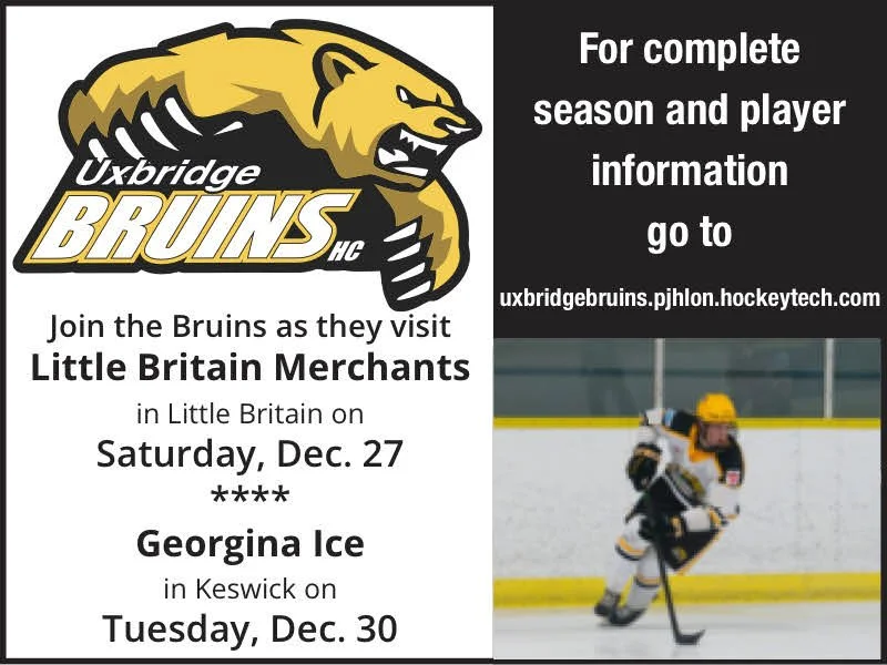 Fans wanting to see the Bruins in action this side of the New Year will have to travel to Little Britain or Georgina. There’s no game this Friday evening, as it’s Boxing Day. The Bruins visit the Merchants on Saturday, Dec. 27, however, and face the Georgina Ice in Keswick on Tuesday, Dec. 30.