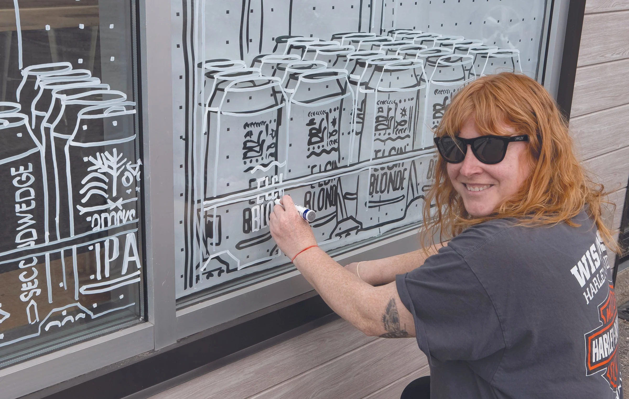 Bird Friendly Uxbridge’s Carly Davenport makes the Second Wedge Brewing Co. a custom-designed migrating bird deterrent for the craft brewery’s windows. Photo by John Cavers