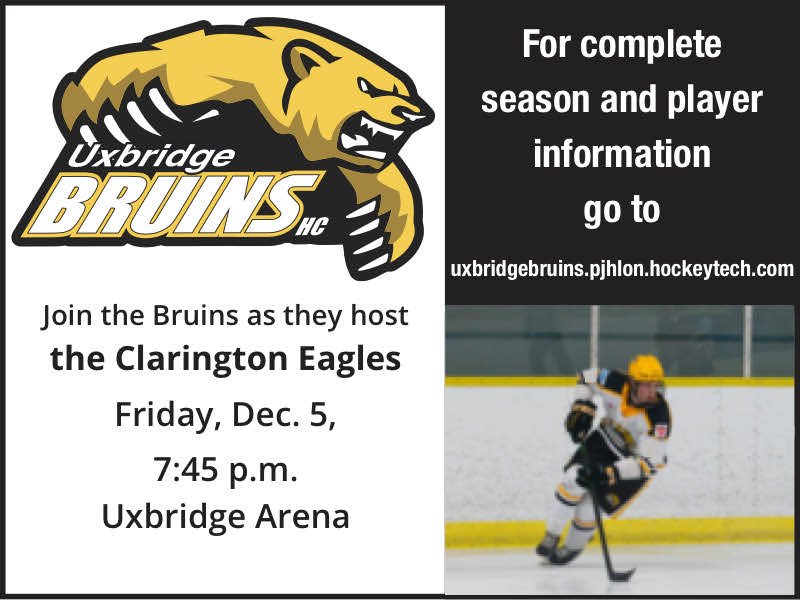 A good chunk of the scoring came last Thursday when the Uxbridge squad travelled to Bowmanville and clobbered the Clarington Eagles 10-2, with Darin Bain scoring a hat-trick. The Bruins scored four goals in the first seven minutes of the opening period, including a power-play marker, before the Eagles scored, also on a power play. The Bruins first goal came less than a minute into the action.