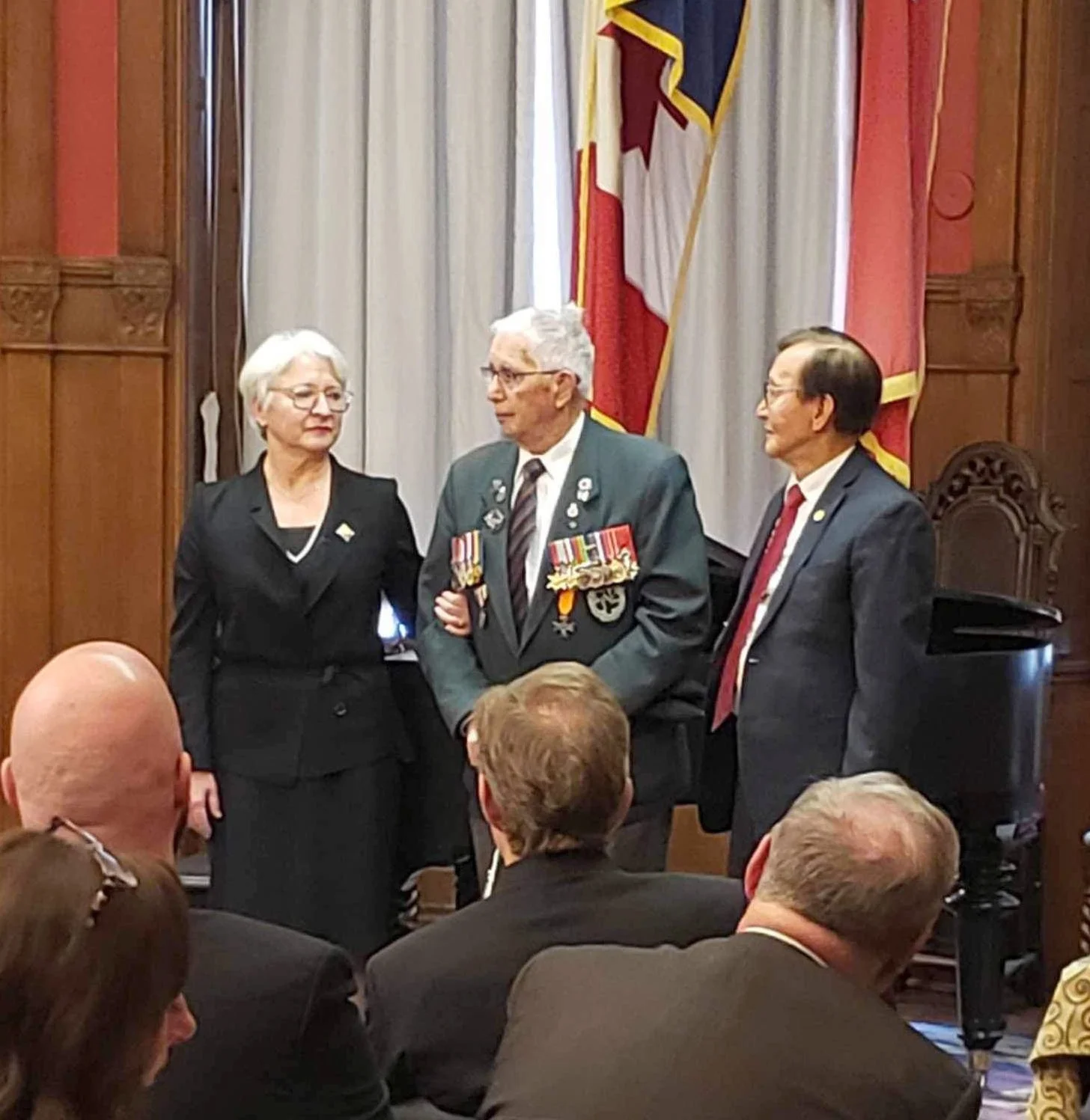 Sgt. James (Jim) Parks receives an Ontario Seniors Achievement Award from Lieutenant-Governor Edith Dumont, and Minister for Seniors and Accessibility Raymond Cho. Photo submitted by Tish MacDonald