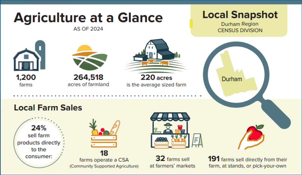 In the Region of Durham, as of 2024, there were 1,200 farms occupying 265,518 acres of farmland, with each farm being, on average, 220 acres. Of these regional farms, 24 per cent sell farm products directly to the consumer. Eighteen regional farms offer CSAs, or community supported agriculture, 32 sell at farmers’ markets, and 191 farms sell directly from their farm, either at stands or pick-your-own.