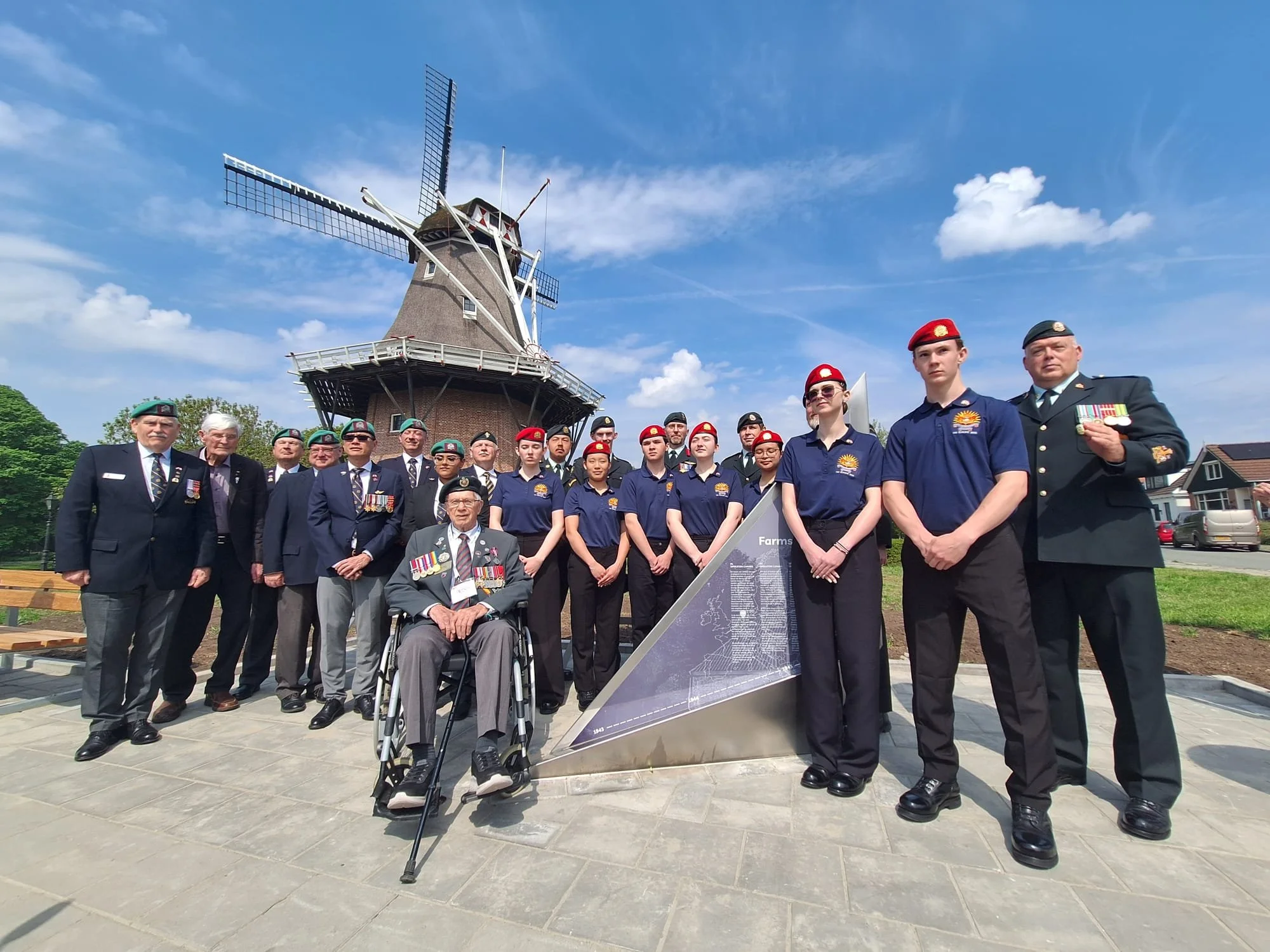 Uxbridge veteran Jim Parks (in wheelchair) unveiled the “Vector of Memory” in Farmsum, The Netherlands, on the weekend. The memorial, near the Aeolus windmill in Farmsum, marks the story of the fierce battles and the liberation of Delfzijl and Farmsum in the final days of the Second World War. Also present were relatives of Canadian liberators from the Westminster Regiment. Photo used with permission from Joel Stoppels, Liberation Route Europe